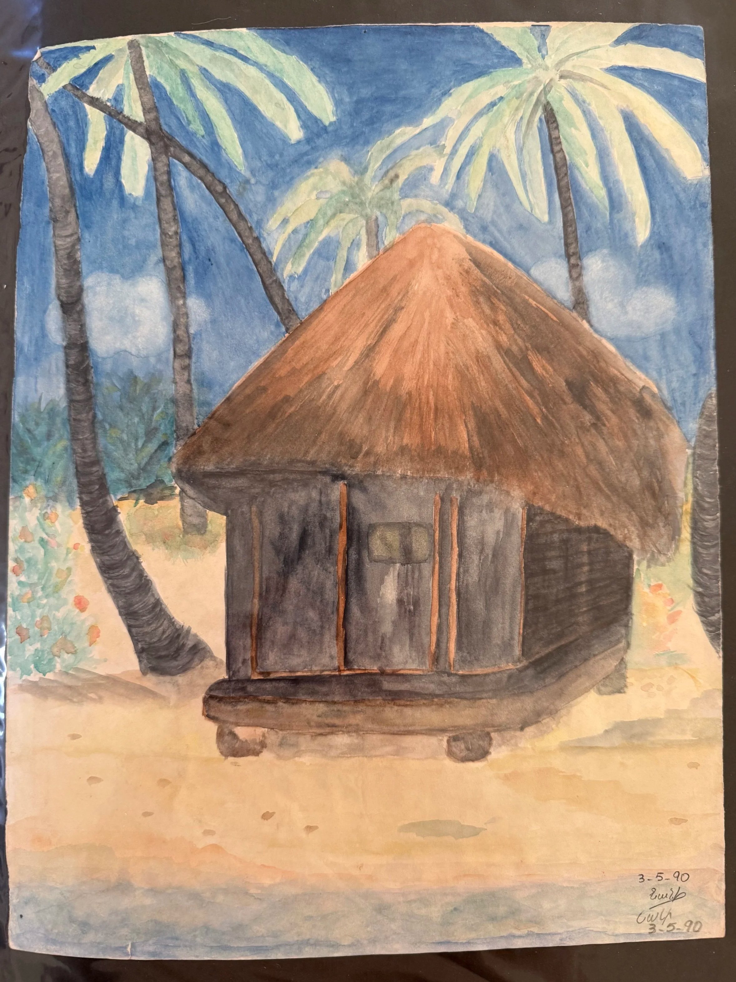 I always imagined myself there when I was in Beirut. I used to tell myself, one day I want to go and touch the white sand, see the coconut trees, and eat coconut like Bouy Bouy Mgnig (The Bouy Bouy Mouse book). I saw some pictures in a magazine, and I painted them, saying: “One day, I want to go.” That was on May 3rd, 1990.